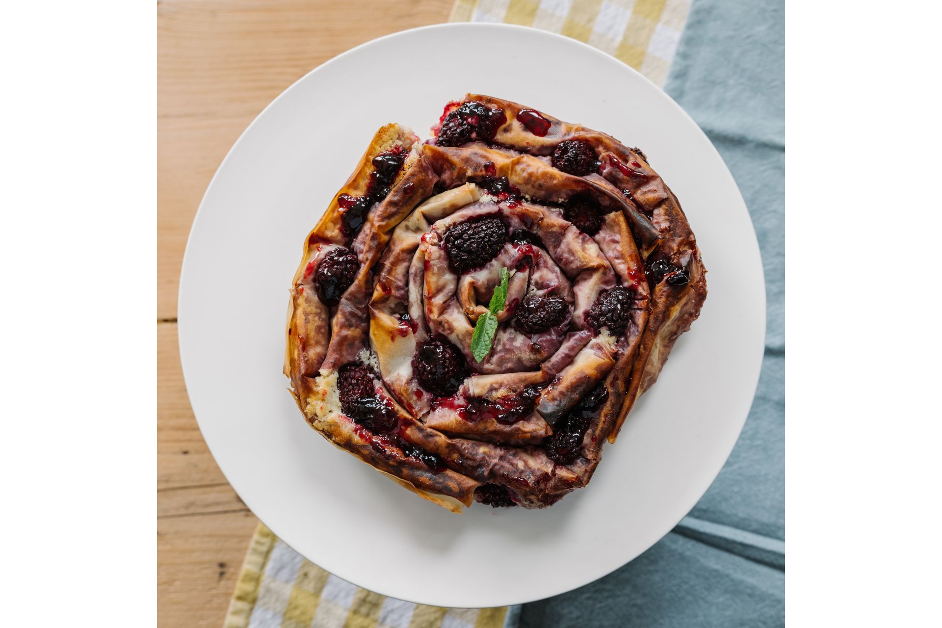 4. Roll the first filo sausage in a spiral in the middle of the tin then place the other around the outside. Repeat to fill the cake tin. Brush the top with egg wash or butter. Sprinkle over the blackberries, wedging a few into the roll. Bake for 25 minutes until golden brown.