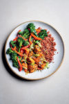 ‘I love firecracker chicken, but in restaurants this dish can be high in sugar and is often unbalanced, with too much rice and not enough protein, vegetables and fibre. So, in my true no-nonsense style, I have decided to give this recipe a healthy Triple 30 makeover by going back to basics. Rather than use sugar, I have used oranges to add a touch of sweetness. I have also reduced the rice serving to the perfect portion size and chosen red or black rice, which have a nutty texture, are slower acting on blood sugars, and contain extra plant pigments called anthocyanins. Feel free to use any rice you like though. I want to give you new ideas and options to jazz up your everyday cooking, but having adaptations can help the recipes fit into your everyday life too! The vegetable side dish is necessary to keep your fibre up, so make sure to include it.’