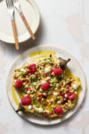 - Transfer the aubergine to a plate, and flatten with the side of a knife. You want a rustic, uneven layer (not too neat). Squeeze over the lemon juice and sprinkle with sea salt. Drizzle over the tahini and follow with the date molasses. Scatter over the pistachios, pomegranate seeds and raspberries (don’t skip them, they cut through the richness beautifully). Dot with the yoghurt (if using) and finish with a glug of olive oil.