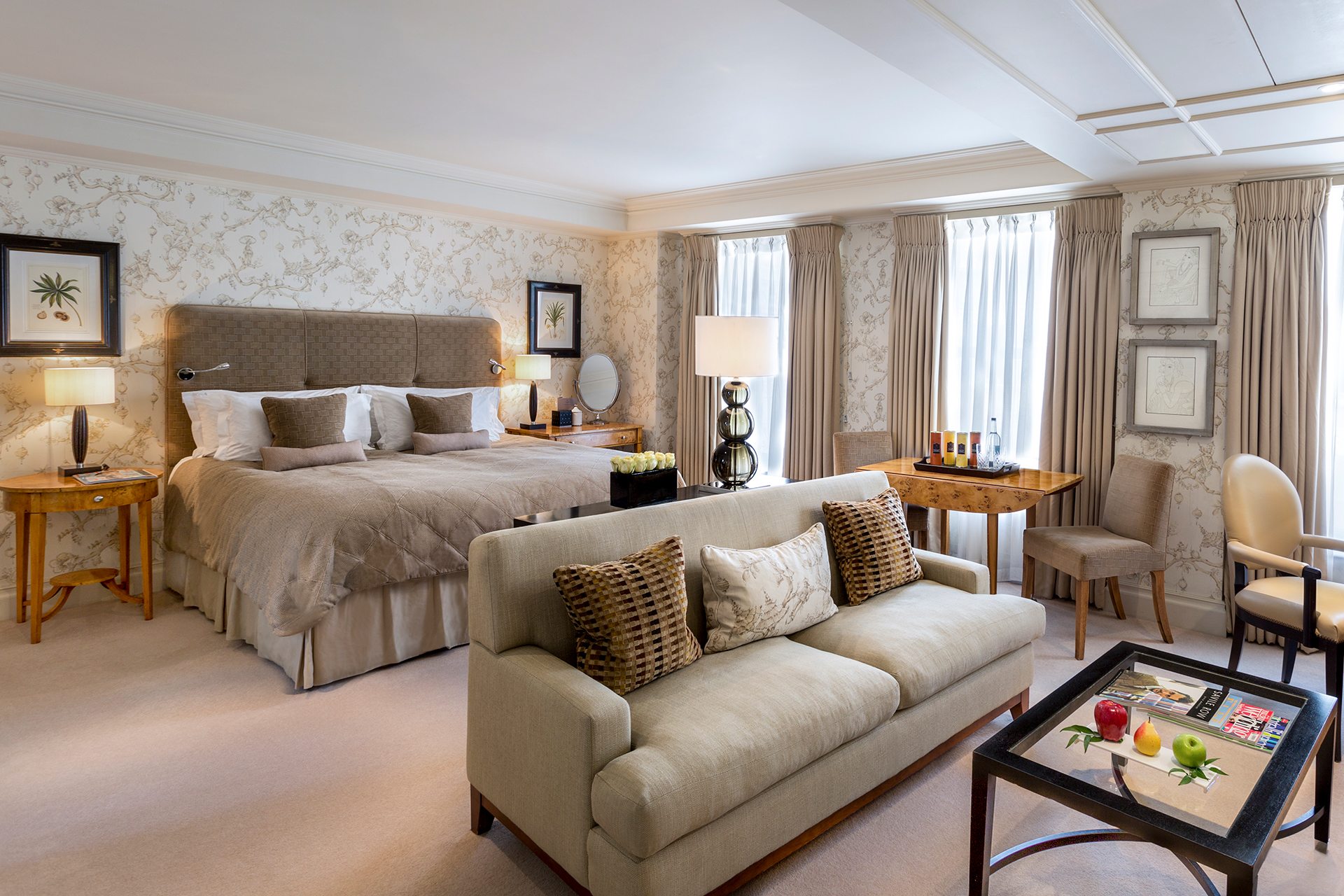 Tucked away in the heart of St James’s, The Stafford has history, hidden delights and personality, not least thanks to master sommelier Gino Nardella, head barman Benoit Provost and head concierge Frank Laino – all characters, all long serving. Its beautifully presented wine cellars are 380 years old and contain 8,000 bottles of the finest wines. It also has its own secret mews off St James’s, a wonderful spot for summertime meals and drinks on the cobbles. It is here you will find both the gorgeous Mews Suites and the new Carriage House suites designed by Alexandra Champalimaud. Eat at newly opened The Game Bird for stylish British comfort food and drink at the adorable American Bar. Encrusted with mementos donated by guests, it was a favourite of US servicemen during the war and remains a bastion of the Manhattan, the Sidecar and the Martini. And then there’s the tale of wartime heroine Nancy Wake… stay, and all will be revealed. Doubles from £394.