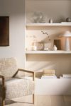 The perfect backdrop for any space, Najwa is keen to remind people that colour isn’t the only way we can inject interest into our homes: ‘Use sculptural pieces. Since the colour is subtle, let bold shapes take centre stage: curved sofas, chunky ceramics, oversized lighting…’, adding that the shade glows in natural light and can ban be brought to life at night with warm lighting. Chrissie similarly advises arranging long stems in glossy, white-glazed clay vases, or wildflowers in sandy-textured bud vases to use the shade in creative ways. ‘Opt for white pieces featuring geometric or organic shapes hand-pressed in papier-mâché, and frame them in warm mango wood for a subtle contrast.’