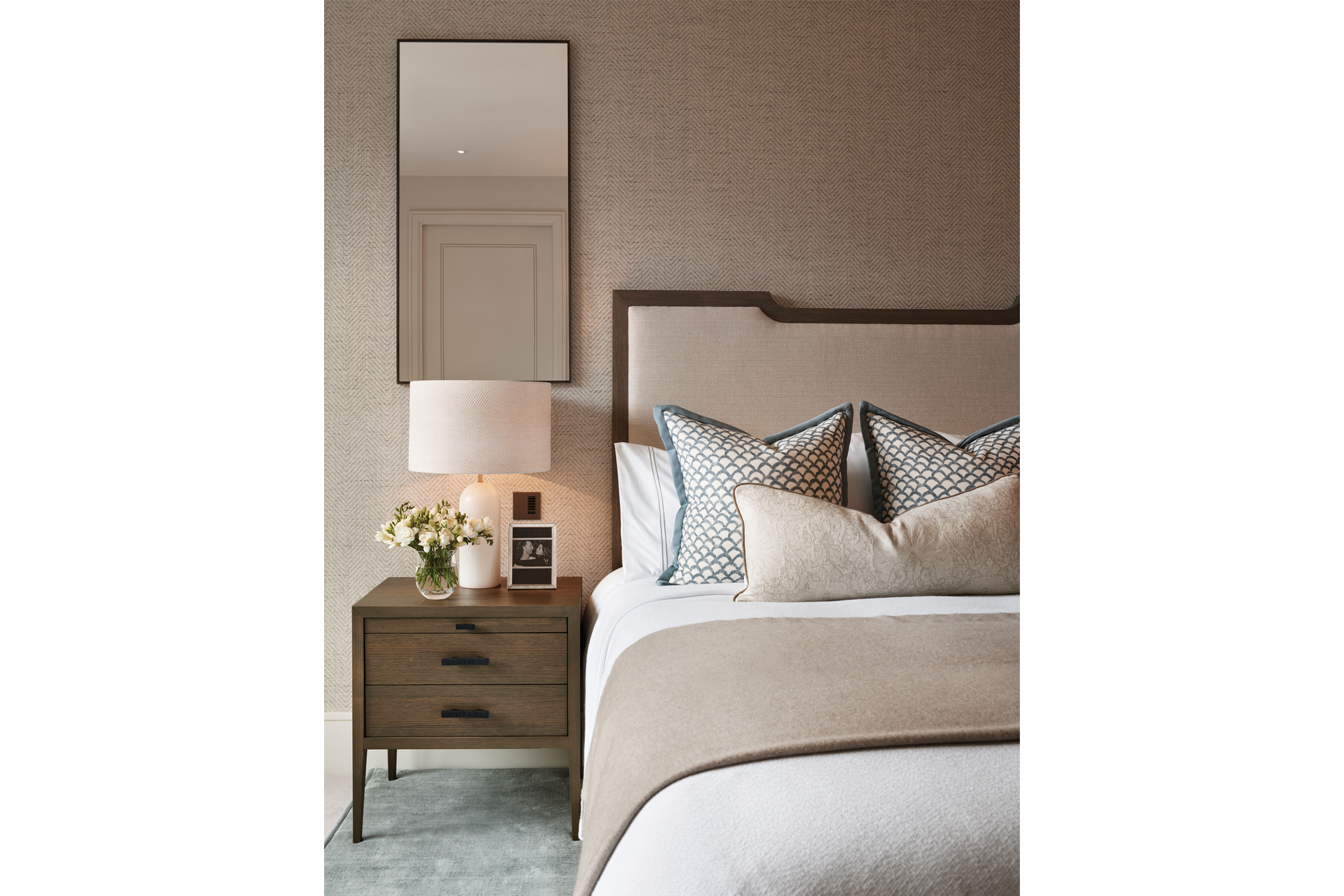One such recent project was 100 Sydney Street, in the heart of Chelsea, where the studio was tasked with creating a show apartment for an upscale development. Soft, tactile fabrics, simple pieces of furniture, accentuated by the natural light of the space, and pops of colour via carefully curated finishes were all layered onto a neutral base. ‘We love working with more weathered furniture items as they lend depth; our wonderful restorers bring them back to life and then we create cohesion with our fabrics through soothing colour tones and thick weaves,’ explains Charlotte-Elizabeth. ‘The addition of sumptuous velvets, silks, handpainted wall coverings and specialist finishes, such as intricate bronze inlays or stone, elevates the scheme with a subtle luxury.’