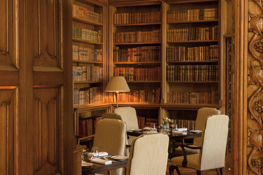 Celebrating the manor’s architectural history while reinvigorating the interiors, Kim employed meticulous attention to detail throughout – from the specially commissioned Pugin-inspired furniture in the Gallery, to the drapery in the Drawing Room that was adapted from an archived 18th-century French brocatelle and re-woven on traditional looms, and the bespoke hand-knotted silk and wool rugs in the Grand Hall. The library is lined with over 3,000 leather-bound books sourced from a bunker in Sweden; individual pages from an original mid-1800s political satire book of cartoons, found in a flea market, have been framed and hang along the corridors.