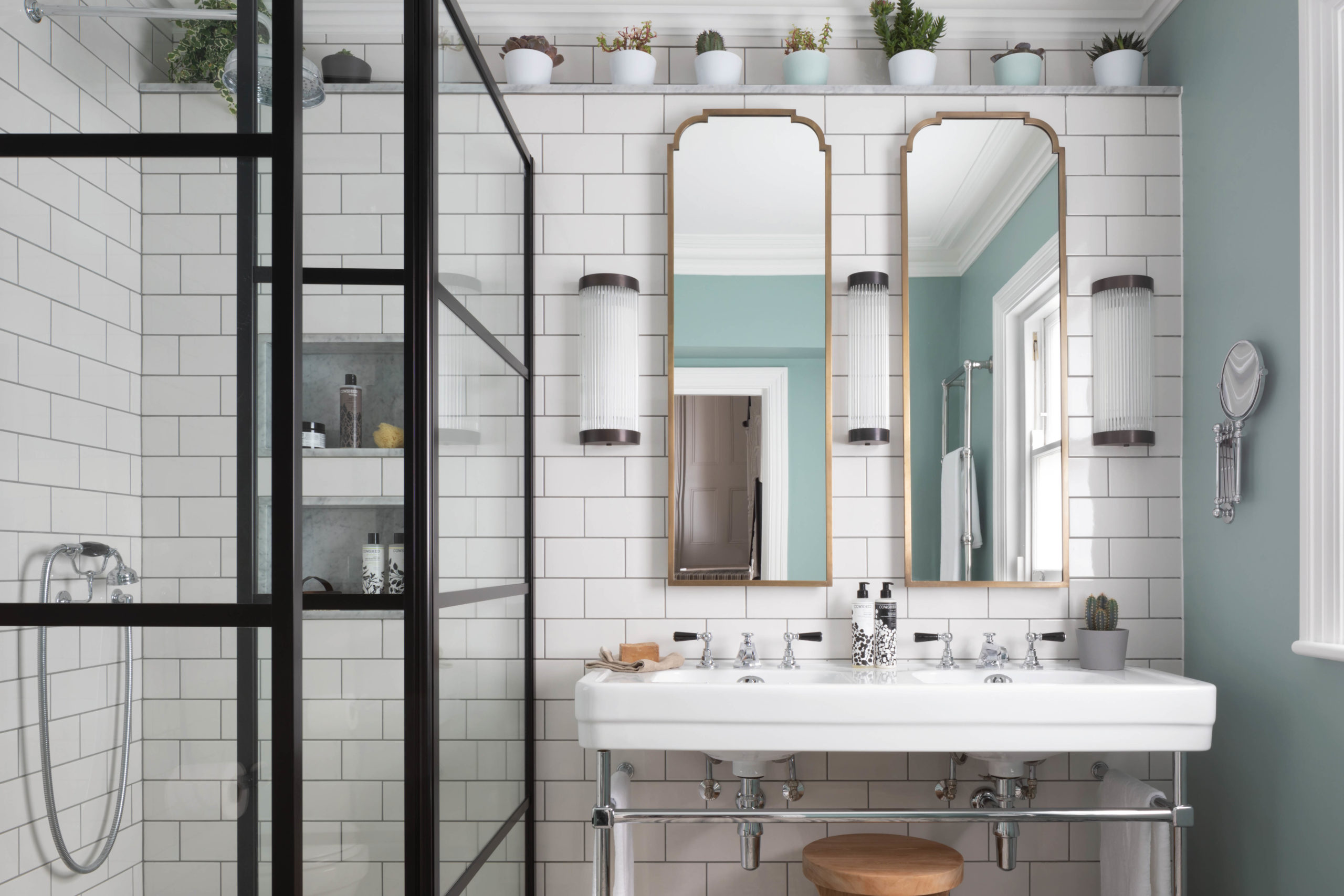One of the latest design trends in the bathroom is colour, especially the idea of integrating soft pastel shades or adding a pop of a stronger tone in the same palette as the rest of the room – be it with wallpaper, basin, different brassware finishes or updating plain tiles with a splash of pattern.