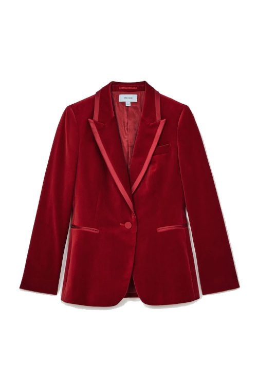 Claudia Winkleman’s usual Round Table go-to is a black blazer, thrown over leggings and chunky black boots. But this look gave us pause. No more monochrome – instead the host taps into a hot red velvet tuxedo blazer from Reiss, which she wears with a silky black Holland Cooper blouse adorned with a bow.