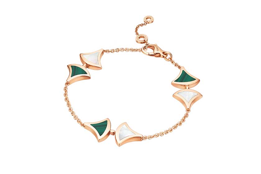 Bulgari Diva Downton bracelet in pink gold, malachite and mother of pearl, £2,980.