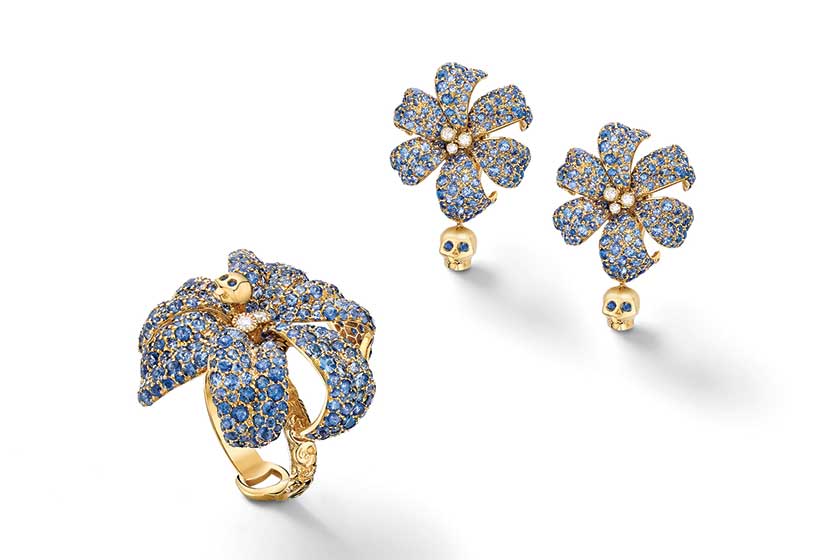 Gucci Flora ring with skull motif in 18kt yellow gold, diamonds and blue sapphires, £10,270.